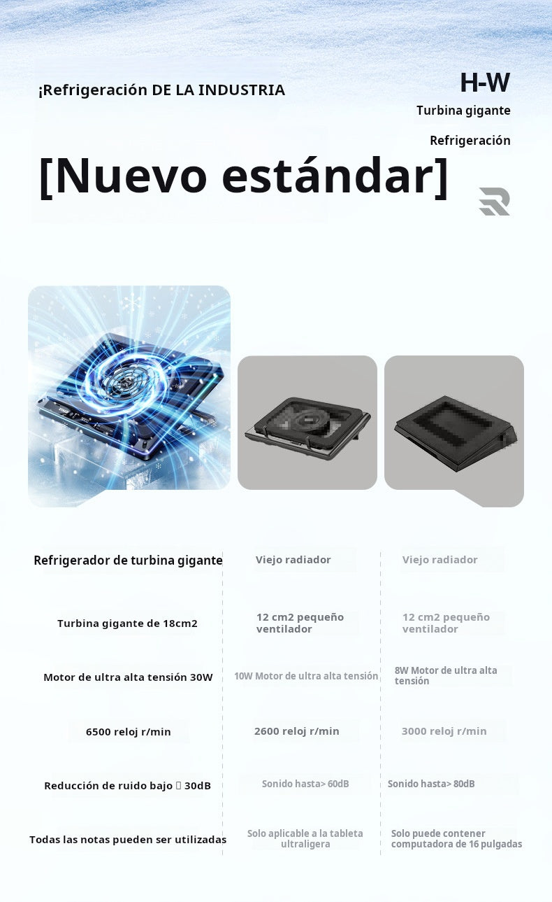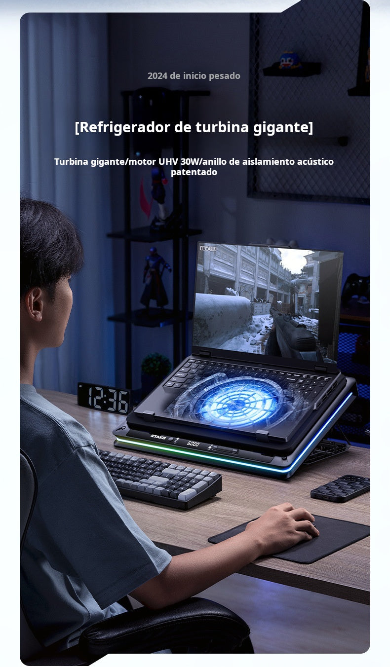 Gran superficie de ventilación que mejora el flujo de aire y aumenta la eficiencia de enfriamiento frente a bases convencionales. -