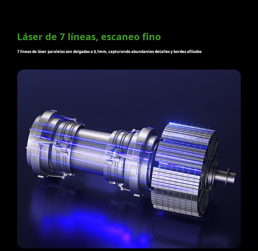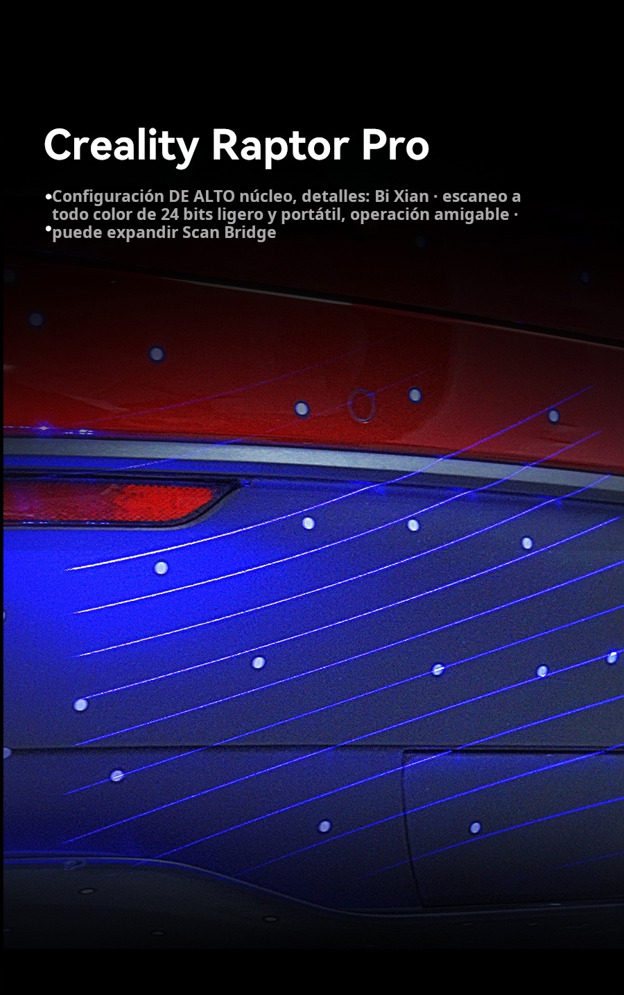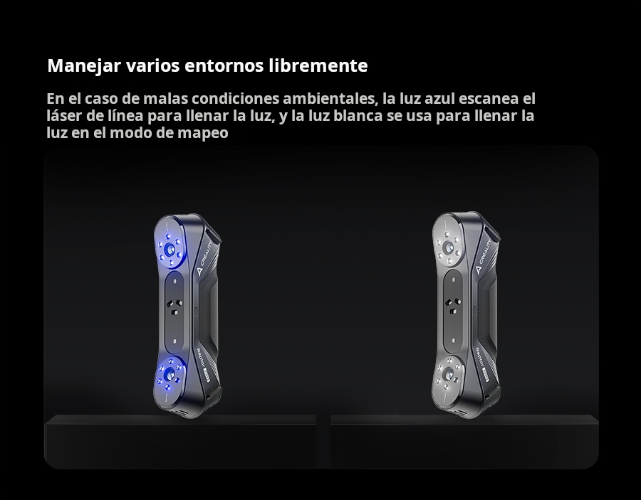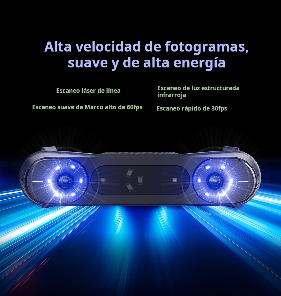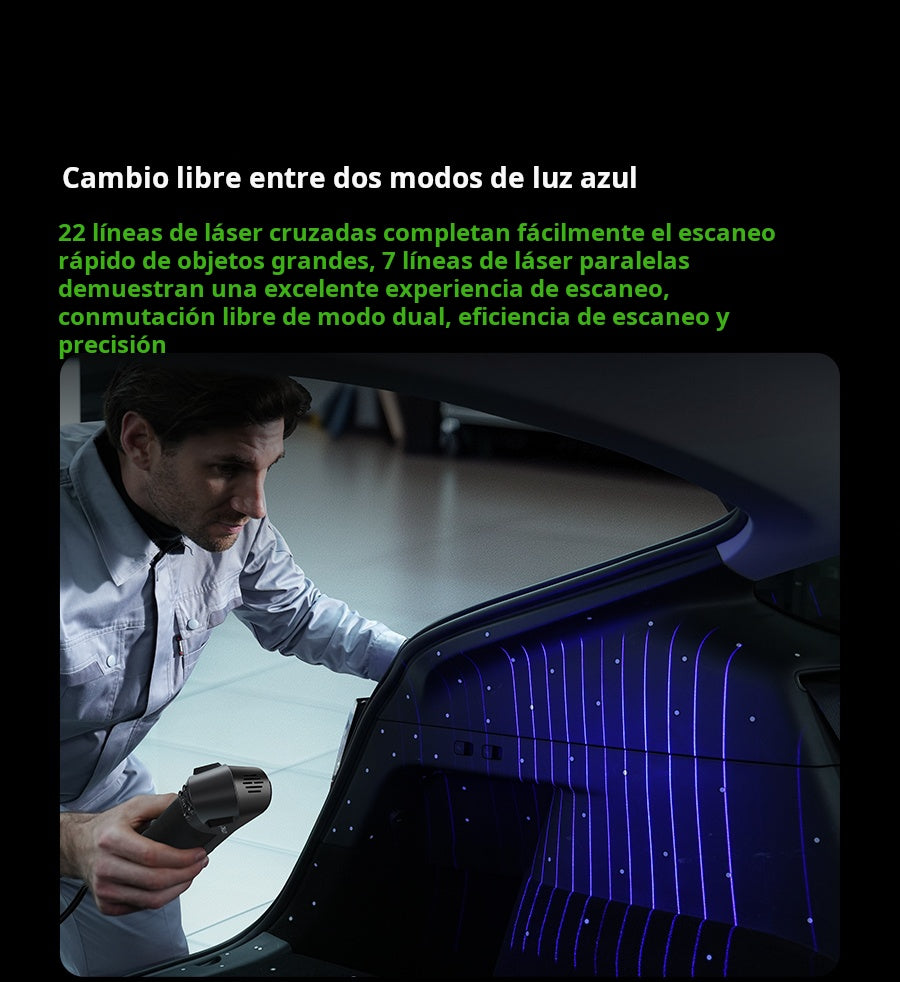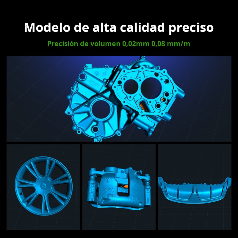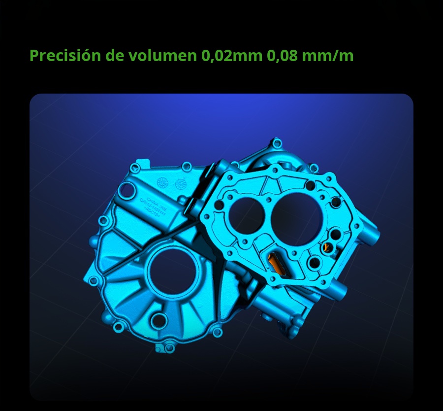 El Creality Raptor Pro es un escáner 3D profesional de doble modo que combina láser azul (22 líneas cruzadas + 7 paralelas) con luz estructurada NIR para capturar desde piezas muy pequeñas hasta objetos de gran tamaño con precisión de 0.02 mm y velocidad hasta 60 FPS / 660 k pts/s. Ofrece precisión volumétrica de 0.02 mm + 0.08 mm/m, rango de trabajo 5–4000 mm, y escaneo de superficies negras o metálicas sin spray. En modo NIR permite escaneo full-color de 24 bits (hasta 30 FPS). Ideal para ingeniería inversa, automotriz, diseño de producto y educación