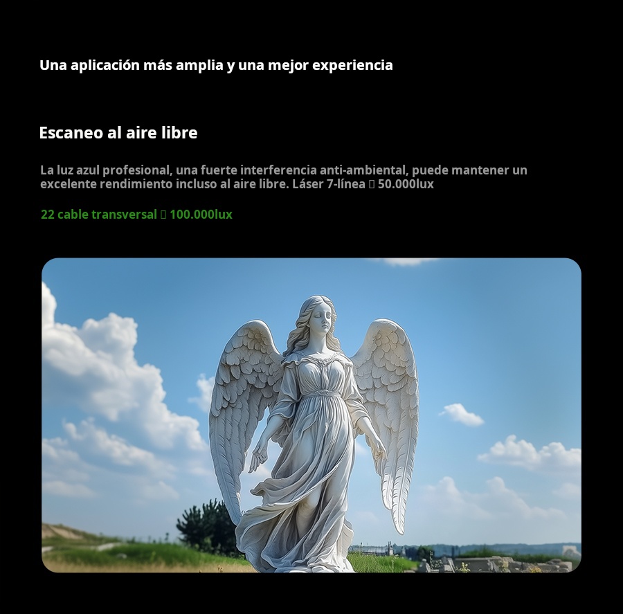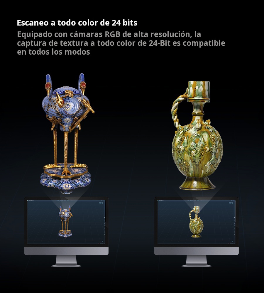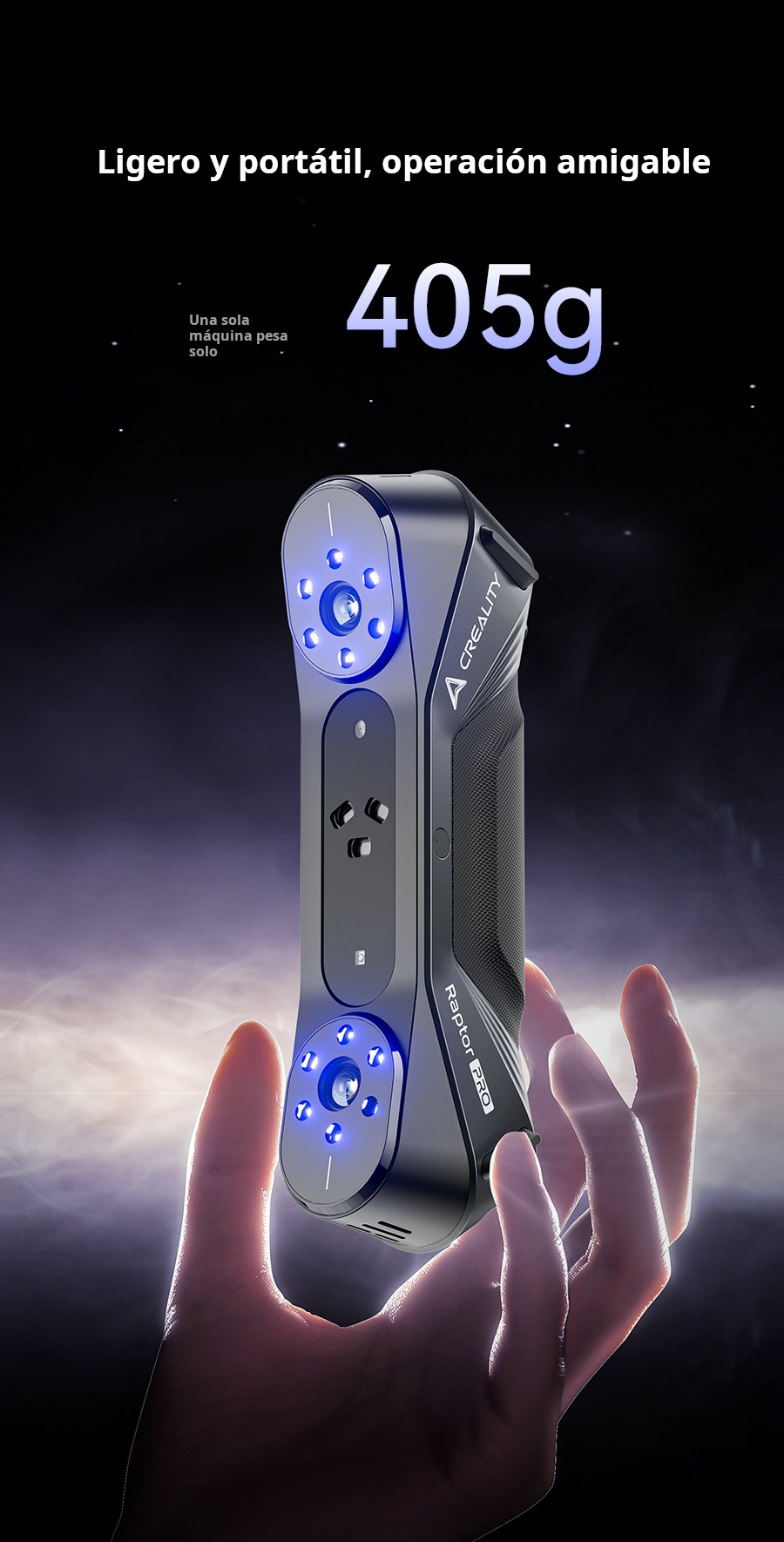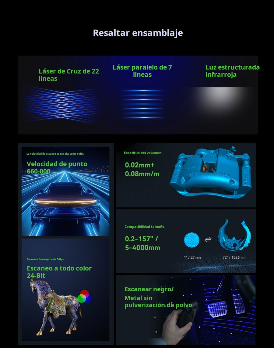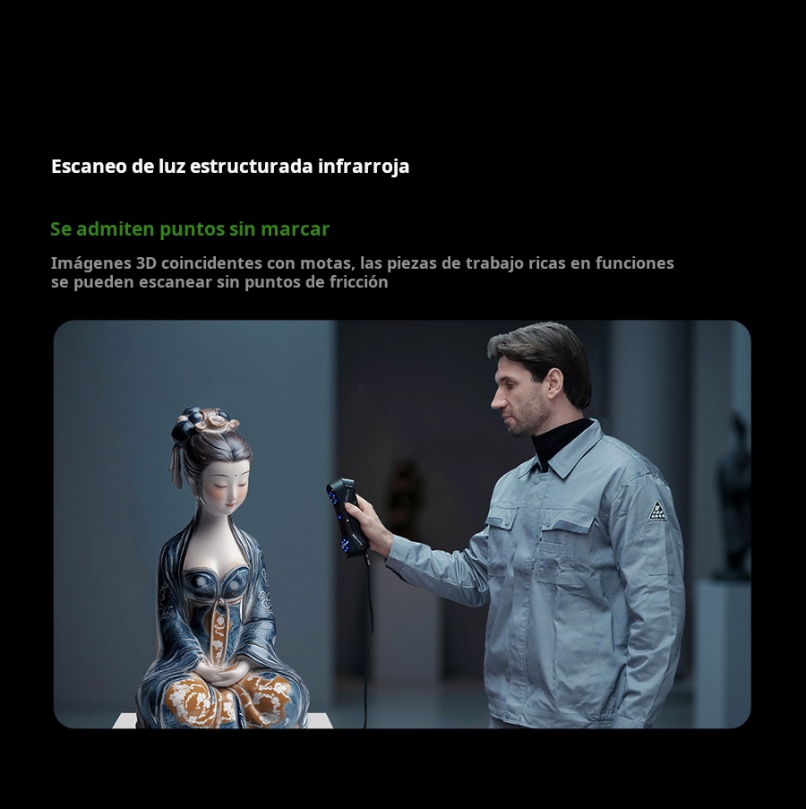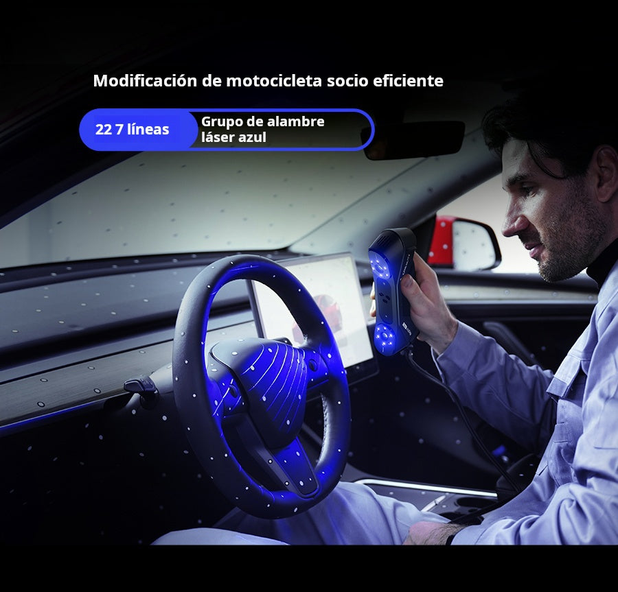 El Creality Raptor Pro es un escáner 3D profesional de doble modo que combina láser azul (22 líneas cruzadas + 7 paralelas) con luz estructurada NIR para capturar desde piezas muy pequeñas hasta objetos de gran tamaño con precisión de 0.02 mm y velocidad hasta 60 FPS / 660 k pts/s. Ofrece precisión volumétrica de 0.02 mm + 0.08 mm/m, rango de trabajo 5–4000 mm, y escaneo de superficies negras o metálicas sin spray. En modo NIR permite escaneo full-color de 24 bits (hasta 30 FPS). Ideal para ingeniería inversa, automotriz, diseño de producto y educación