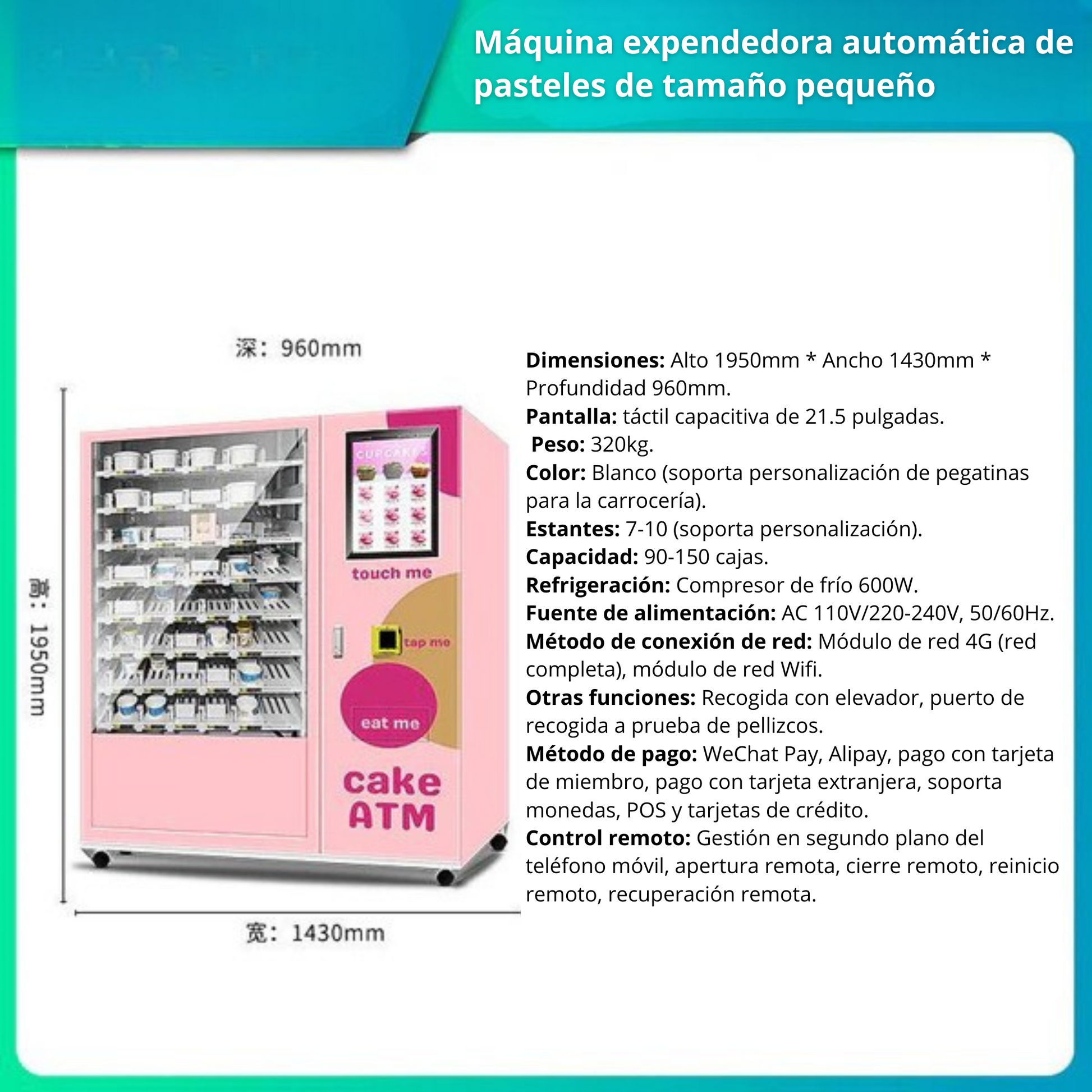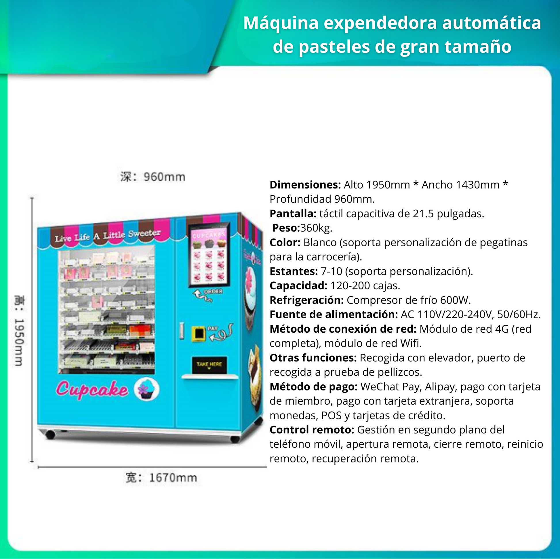 Esta máquina expendedora de pasteles y postres es ideal para automatizar tu tienda y emprender en el negocio. Con pantalla táctil de 21,5 pulgadas y funcionamiento las 24 horas los 365 días, ofrece autoservicio y comodidad para tus clientes. ¡No pierdas la oportunidad de mejorar tu negocio con esta máquina expendedora de alta calidad!